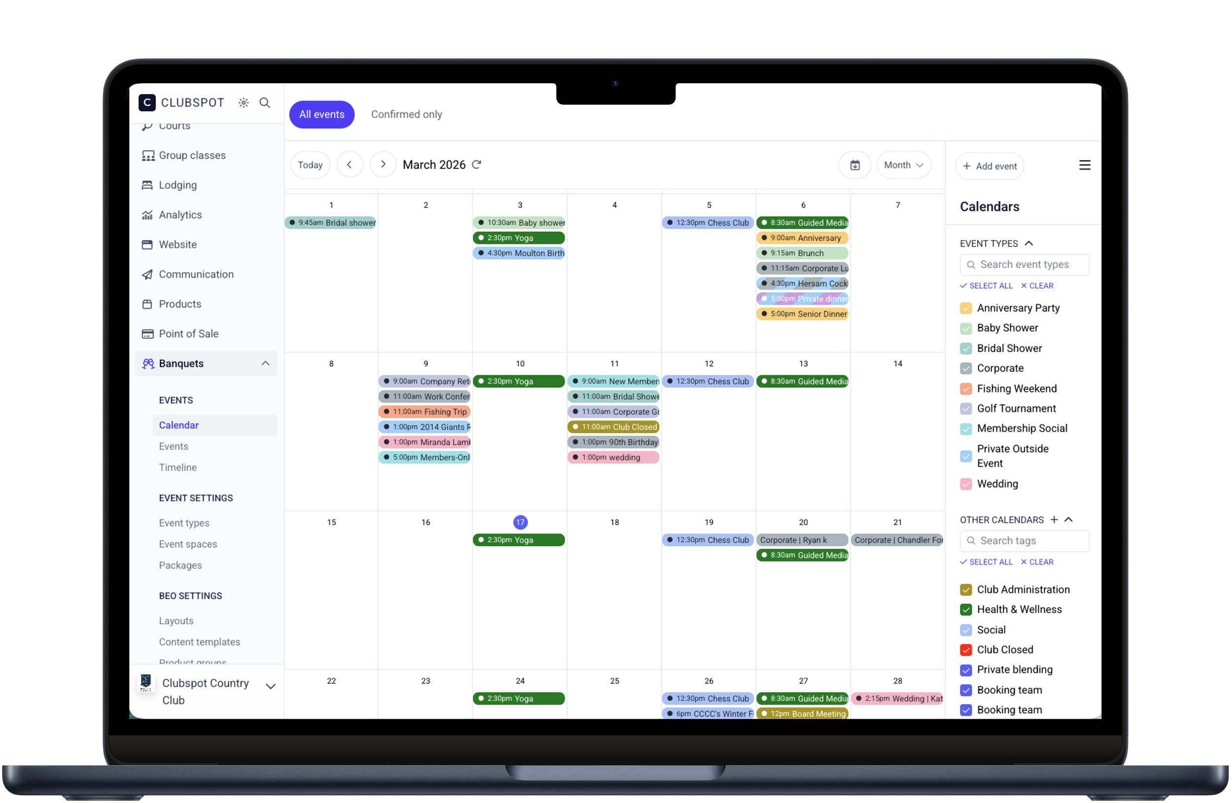 A unified events calendar gives staff full visibility into club activity—from private events to member programming—in one place.