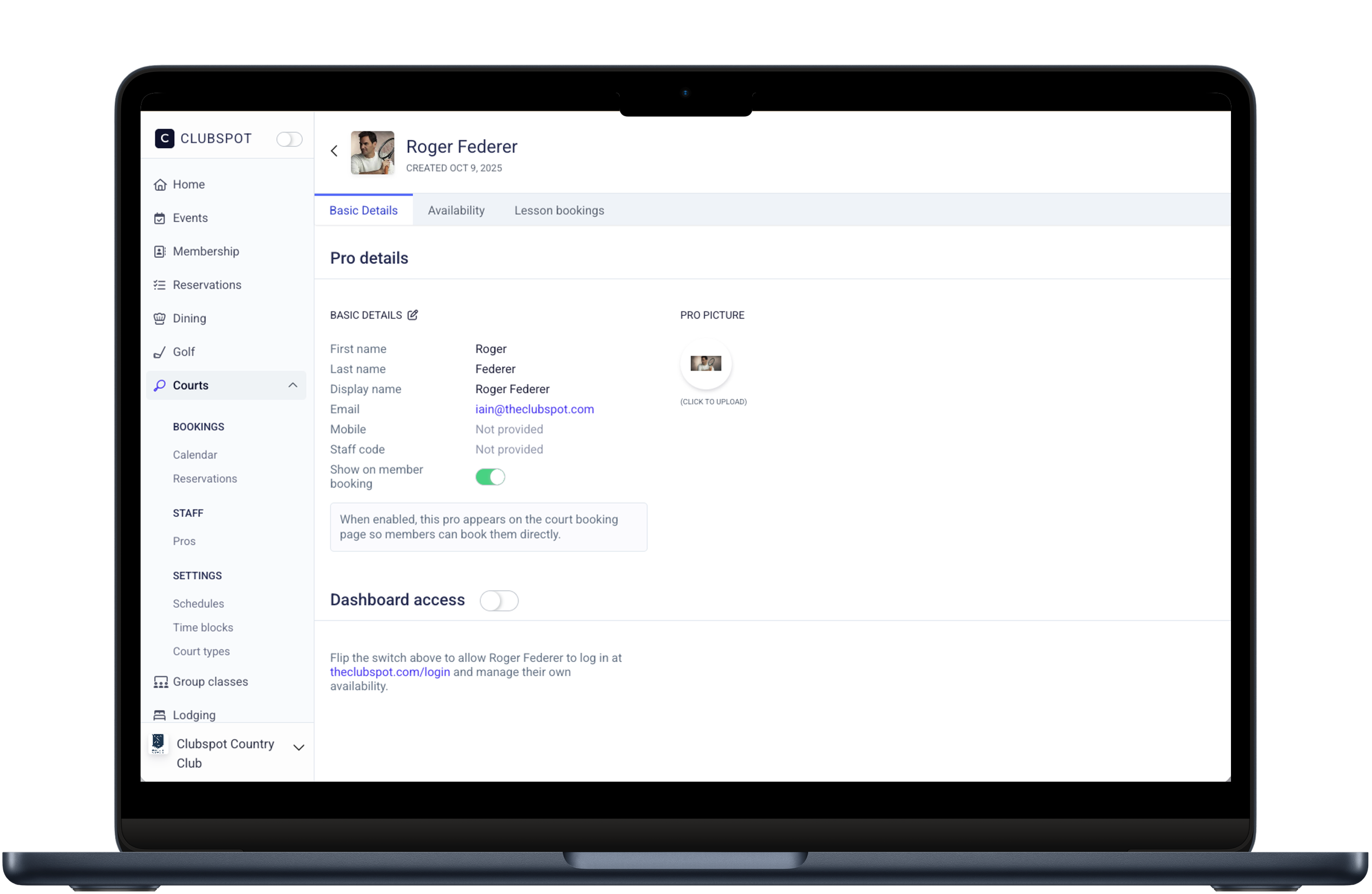 Club staff profiles can now be configured with detailed booking settings, allowing pros to manage availability and accept lesson bookings directly through Clubspot.
