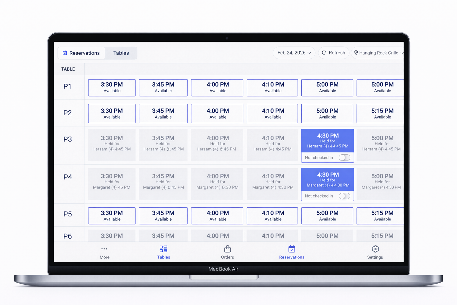 In Host Mode, teams can view a live table map that clearly shows whether tables are available, reserved, or seated, alongside a chronological list of the day’s reservations. Visual progress bars track each table against expected turn times, while countdowns to upcoming reservations help staff anticipate pressure before it builds. Managers can even preview the dining room at a future date and time — enabling smarter staffing decisions and better preparation for busy weekends, tournaments, and special events. These capabilities go far beyond what traditional club software systems were originally built to handle.